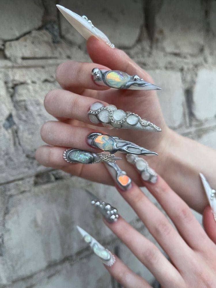 4. Mẫu Nail Nhũ Bạc Kết Hợp Vẽ Nổi Và Phụ kiện: Nail cũng được xem như là một món phụ kiện quan trọng để giúp cho outfit của bạn trông nổi bật hơn. Vậy hôm nay outfit của bạn là gì? Bạn không muốn một bộ nail đơn giản? Bạn muốn nó trông thật sang chảnh và bắt mắt? Bạn muốn mọi đường nét trên mọi ngón tay của bạn thật cầu kì nhưng tinh tế? Mẫu nail mang phong cách YK2 này dành cho bạn. Sự trẻ trung và tính thẩm mĩ cao cùng đường nét uốn lượn sẽ giúp bạn thực sự hài lòng và tự tin hơn với mẫu nail này.