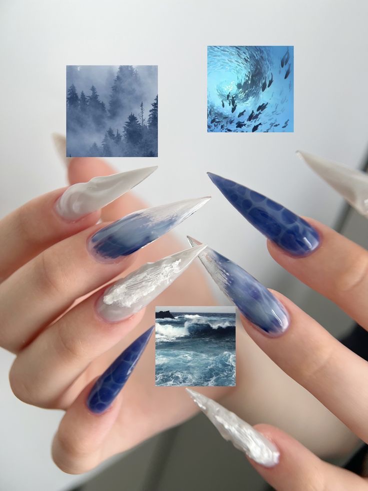 2. Mẫu Nail Màu Xanh Biển Kết Hợp Màu Trắng: Bạn là một cô gái yêu đại dương? Bạn yêu sự tươi mát và trẻ trung? Bạn muốn bộ nail của mình như một dại dương thu nhỏ? Đây là bộ nail dành cho bạn. Với phong cách nhẹ nhàng bay bổng và sự kết hợp hoàn hảo của màu trắng và màu xanh bộ nail của bạn sẽ trông hài hoà và bắt mọi ánh nhìn.