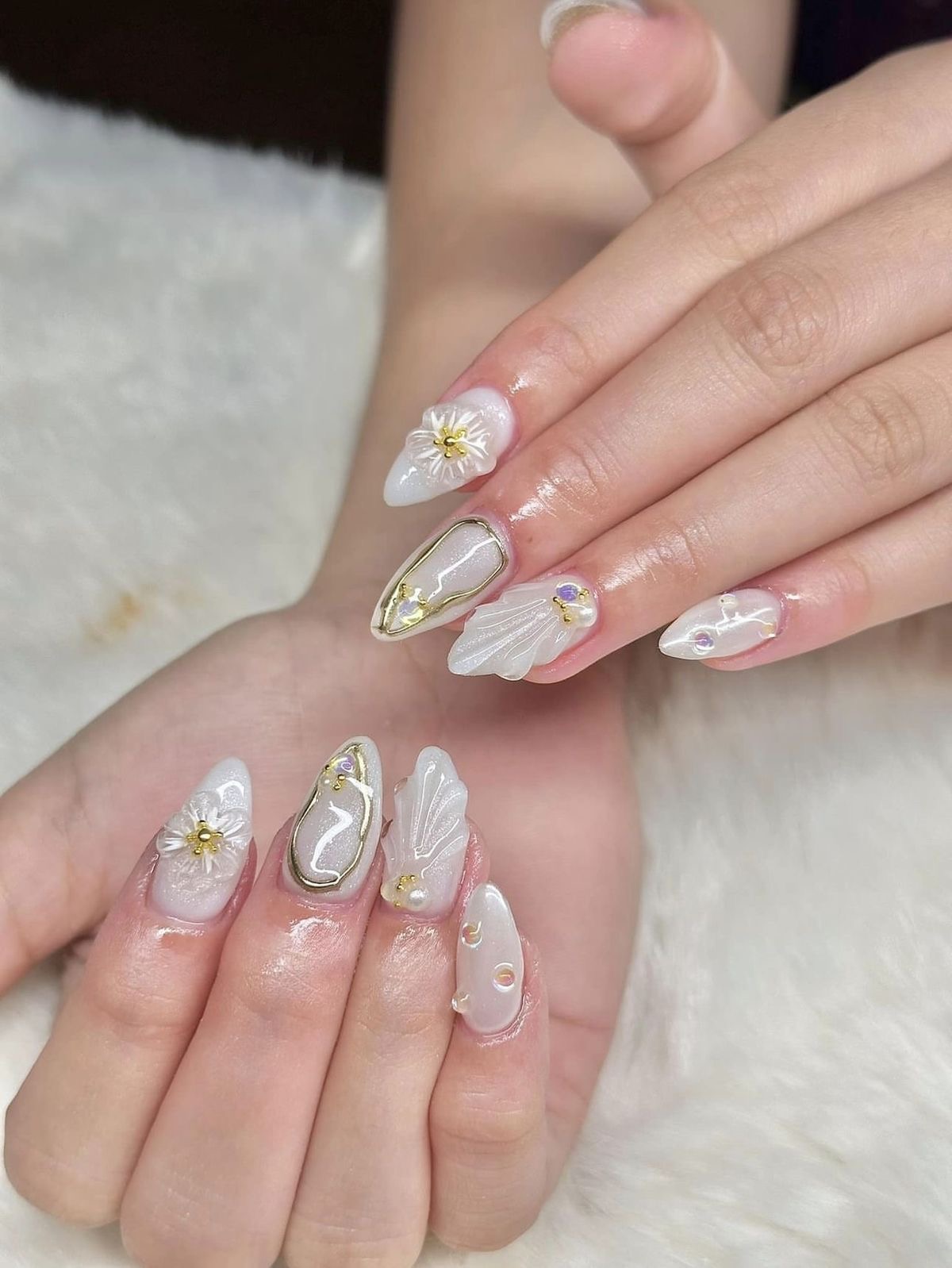 - Mẫu Nail Thạch Trắng Gạo Kết Hợp Chrome Và Vẽ Gel Nổi: Mẫu nail với vẻ đẹp trong trẻo và mềm mại này sẽ phù hợp cho cô nàng có Vibe tiểu thư ngày hôm nay. Bạn sẽ mặc một chiếc váy trắng xinh đẹp và kết hợp với em nó, một outfit nhẹ nhàng thu hút ánh nhìn từ một cô tiểu thư. Bộ Nail trắng thạch gạo này cũng rất là tôn da nên các nàng không phải lo lắng liệu nó có hợp với làn da ngăm hay không?